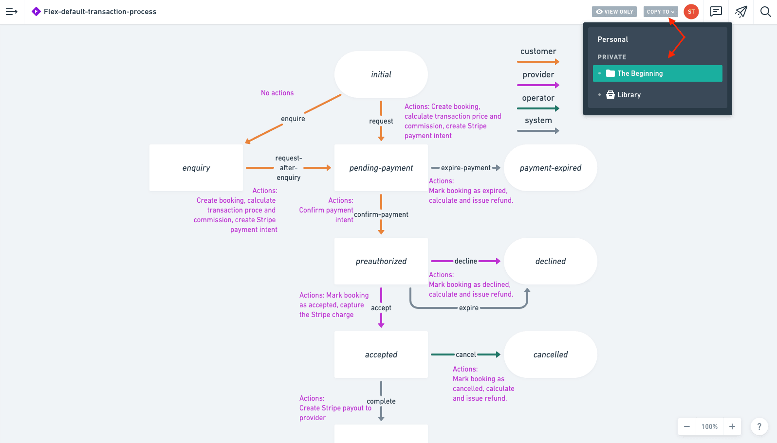 Start by identifying the various states of a transaction and mapping the possibilities users have to move through them. You’re trying to show how customers and providers transact on your platform from start to finish.