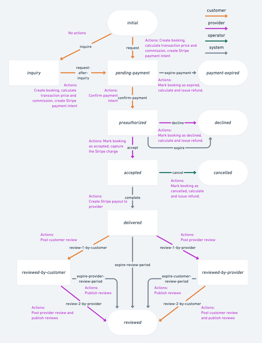 Actions describe what happens as part of a transition. For example, the transaction process allows users to transition from accepted state to delivered or cancelled. The transaction may “complete” automatically, or the operator may “cancel” it with the respective transitions. “Complete” actions involve creating a payout to the provider via Stripe (Flex’s payment gateway). “Cancel” actions, on the other hand, include cancelling the booking and issuing a refund.