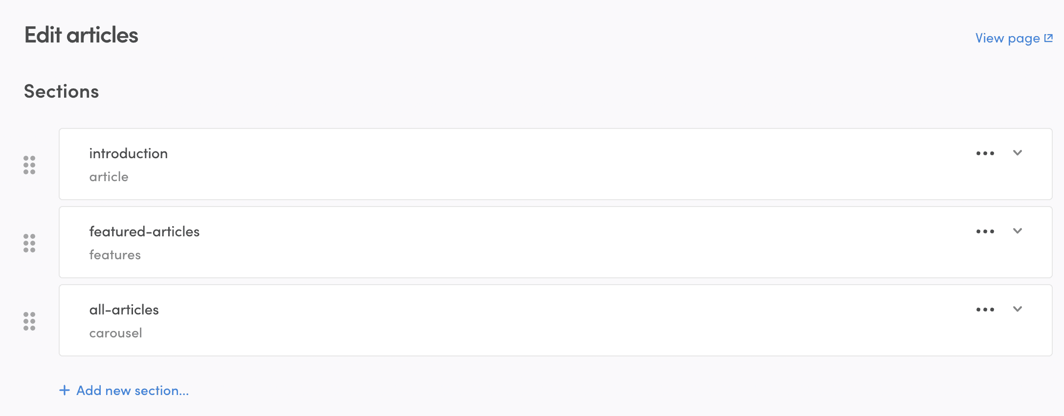 In each section, you can define a title, ingress content, and blocks for your copy text. After you save the changes you made, you can click the "View page" link in the top right corner of the page editor to see your changes.