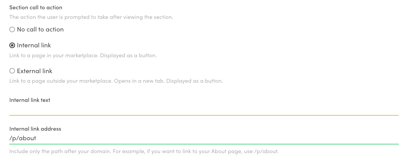 In addition to adding links in the text in Markdown, you can add calls to action in both sections and blocks. A call to action can be either an internal link or an external one.