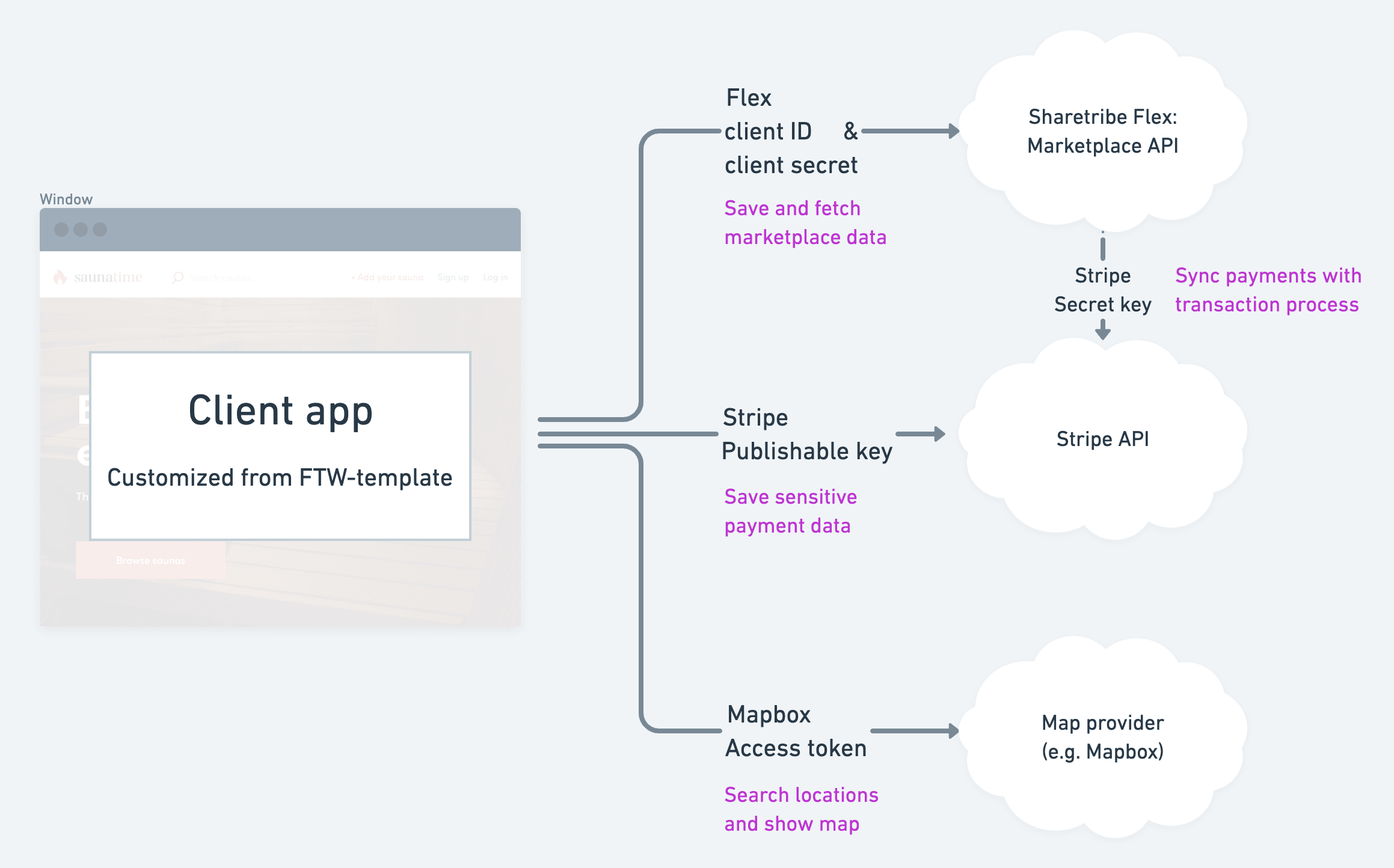 The Sharetribe Web Template has 3 mandatory integrations that you need to configure before the app is fully functional. The app obviously needs to discuss with Flex Marketplace API, but the client app also makes direct calls to Stripe. Flex uses Stripe as a payment processor, and Sharetribe Web Template saves sensitive payment information directly to it.