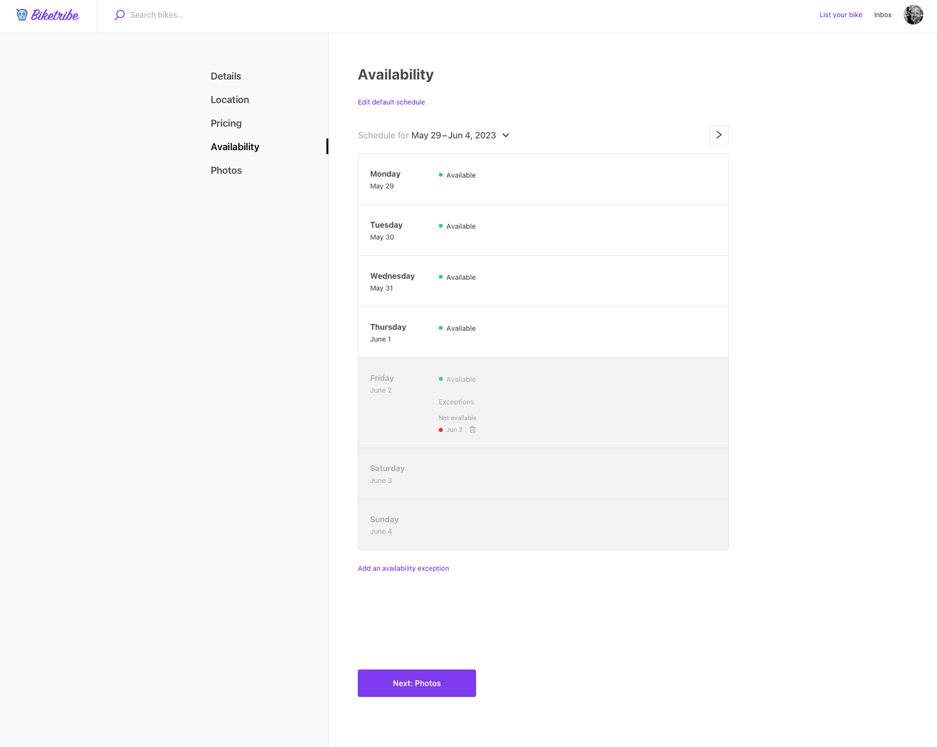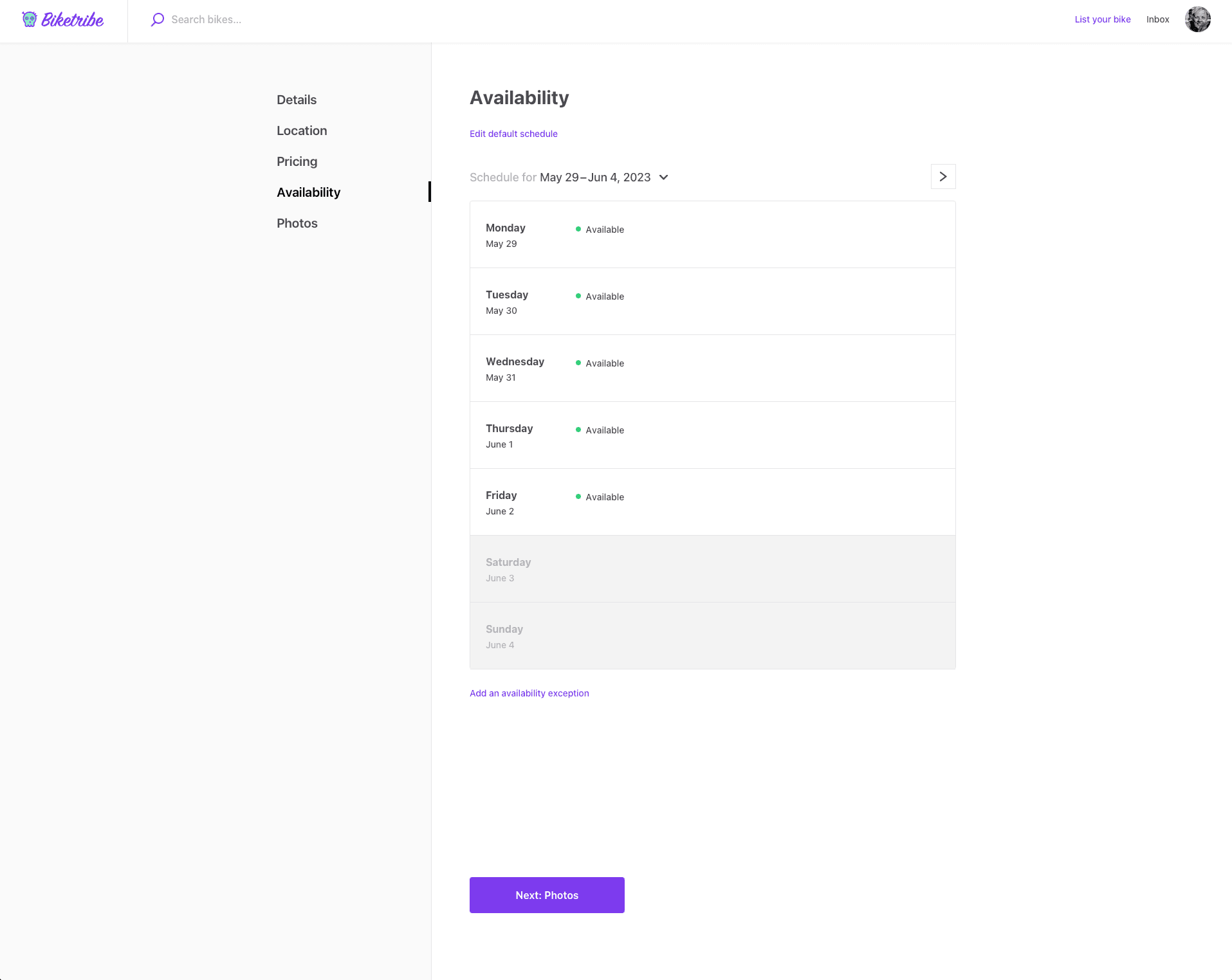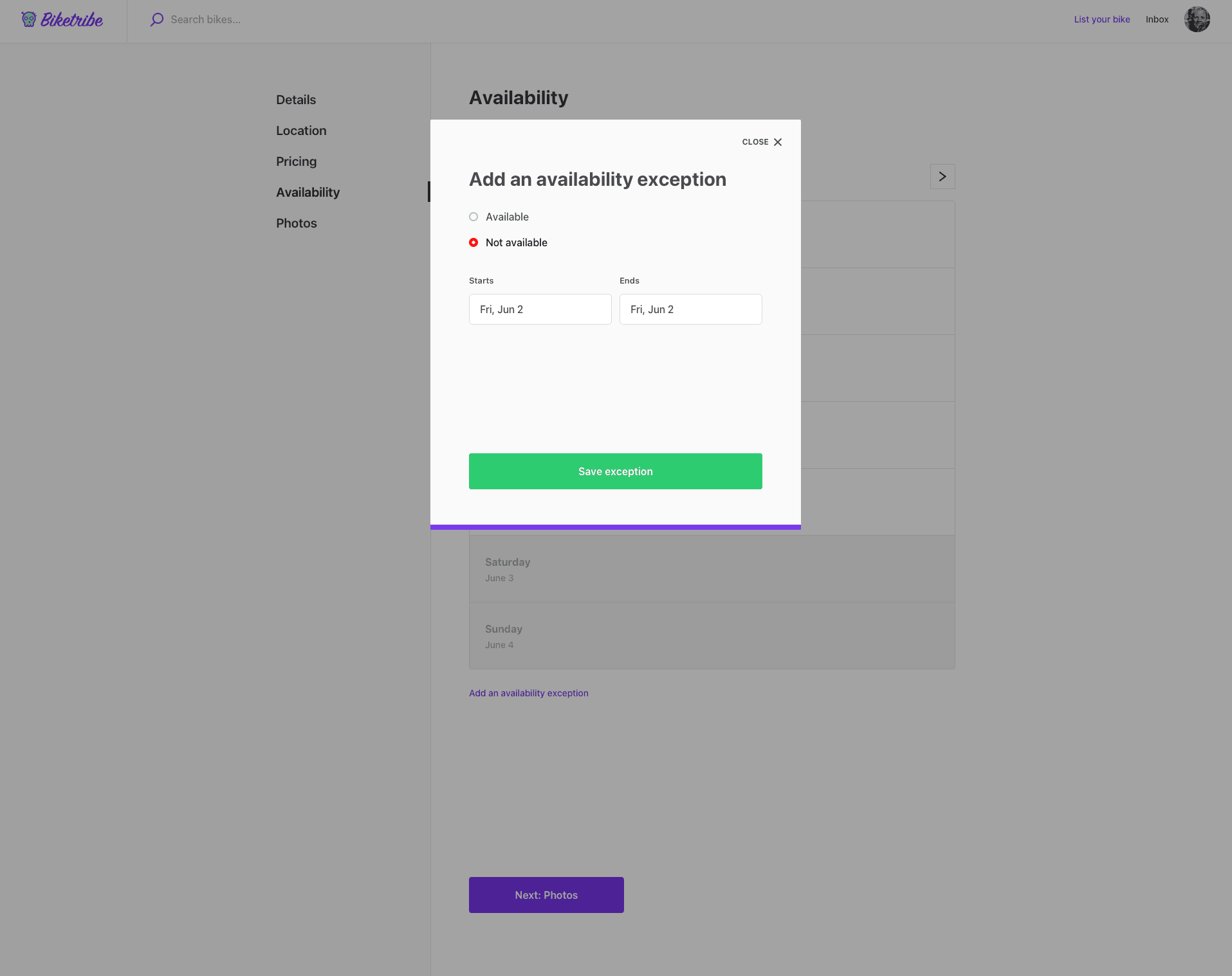 If a seller wants to set exceptional availability outside of their default schedule, they can set an “Availability exception”. Availability exceptions allow sellers to add specific days or nights when they are or are not available, overriding their default calendar. If the seller does not have any kind of recurring schedule, they can leave the regular schedule completely unavailable and manage their availability just by adding exceptions.