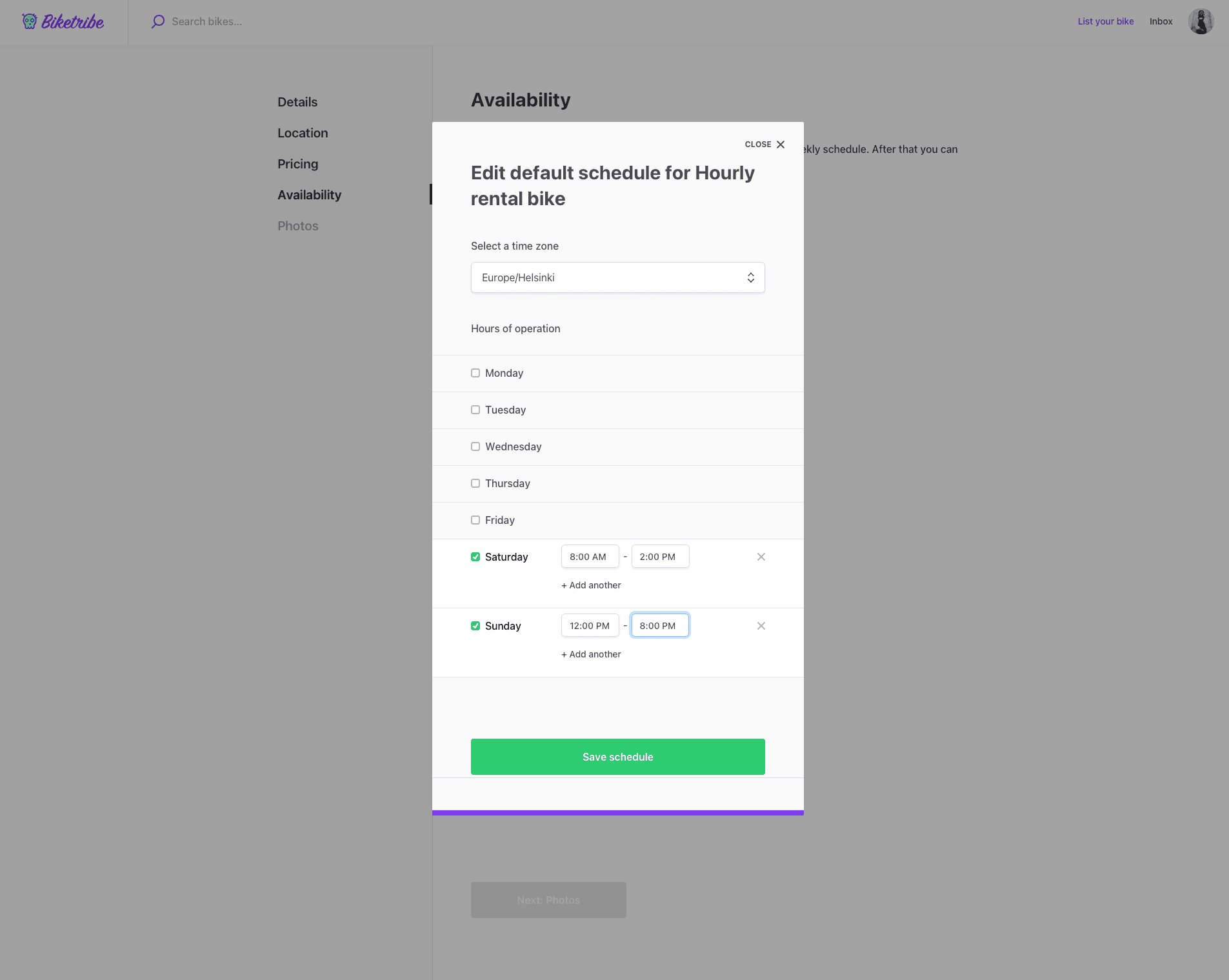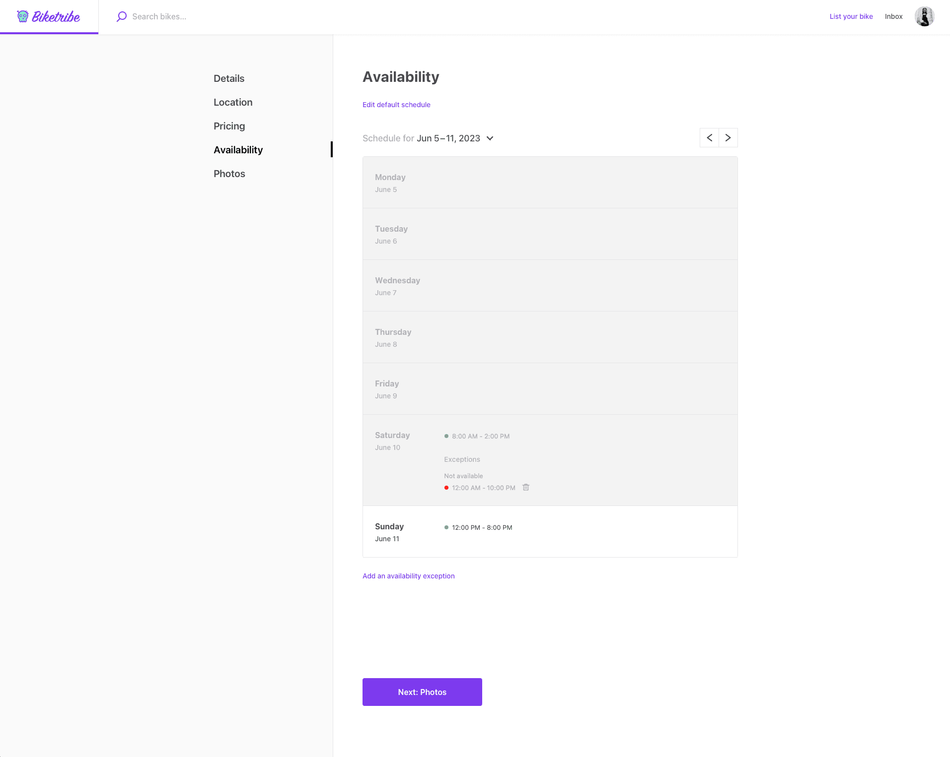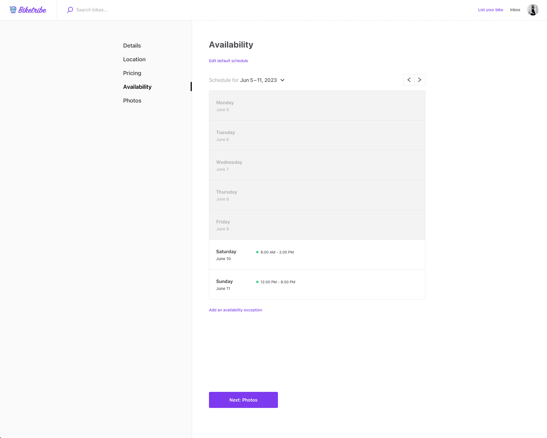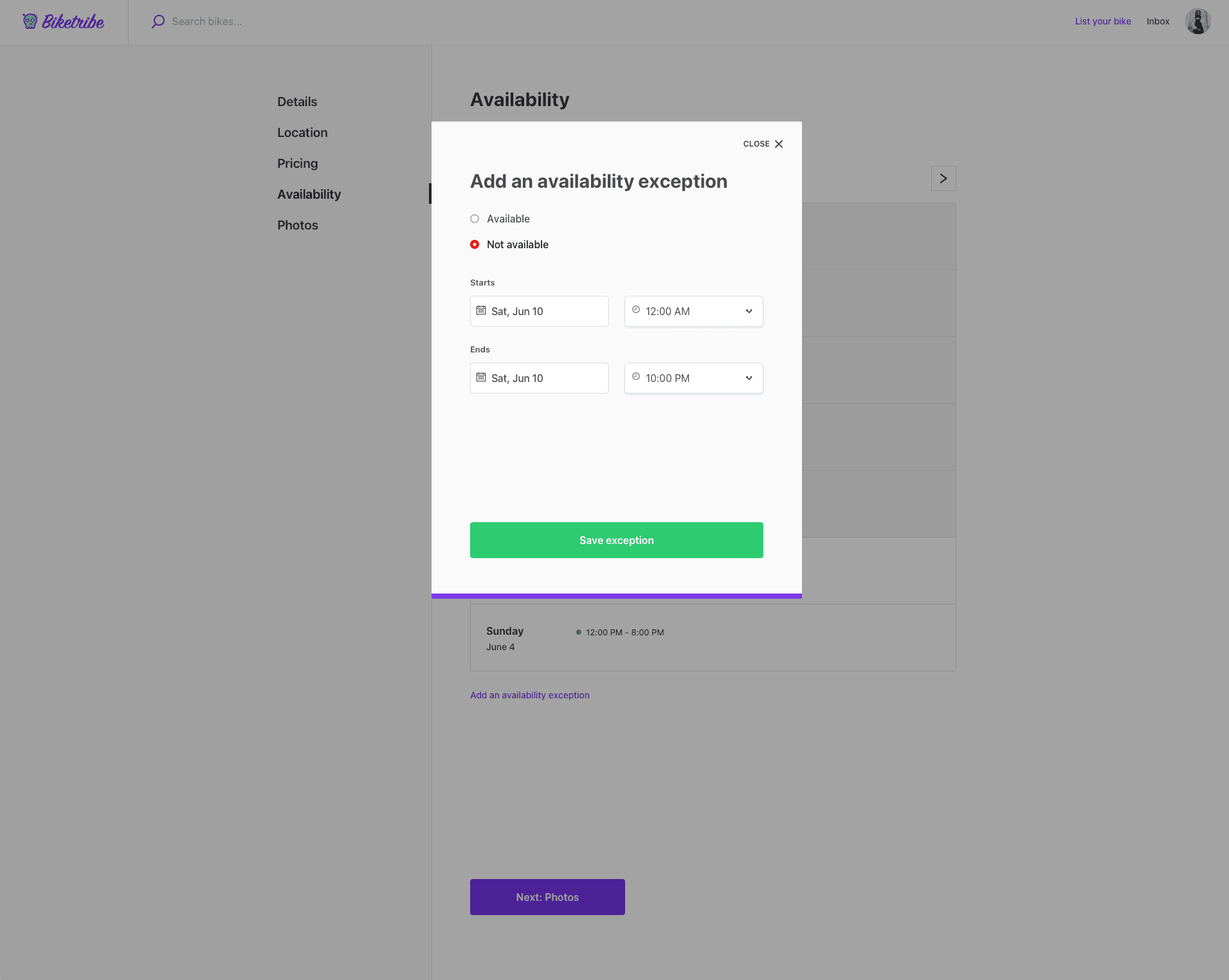 If a seller wants to set exceptional availability outside of their default schedule, they can set an “Availability exception.” Availability exceptions allow sellers to add specific dates and times when they are or are not available, overriding their default calendar.