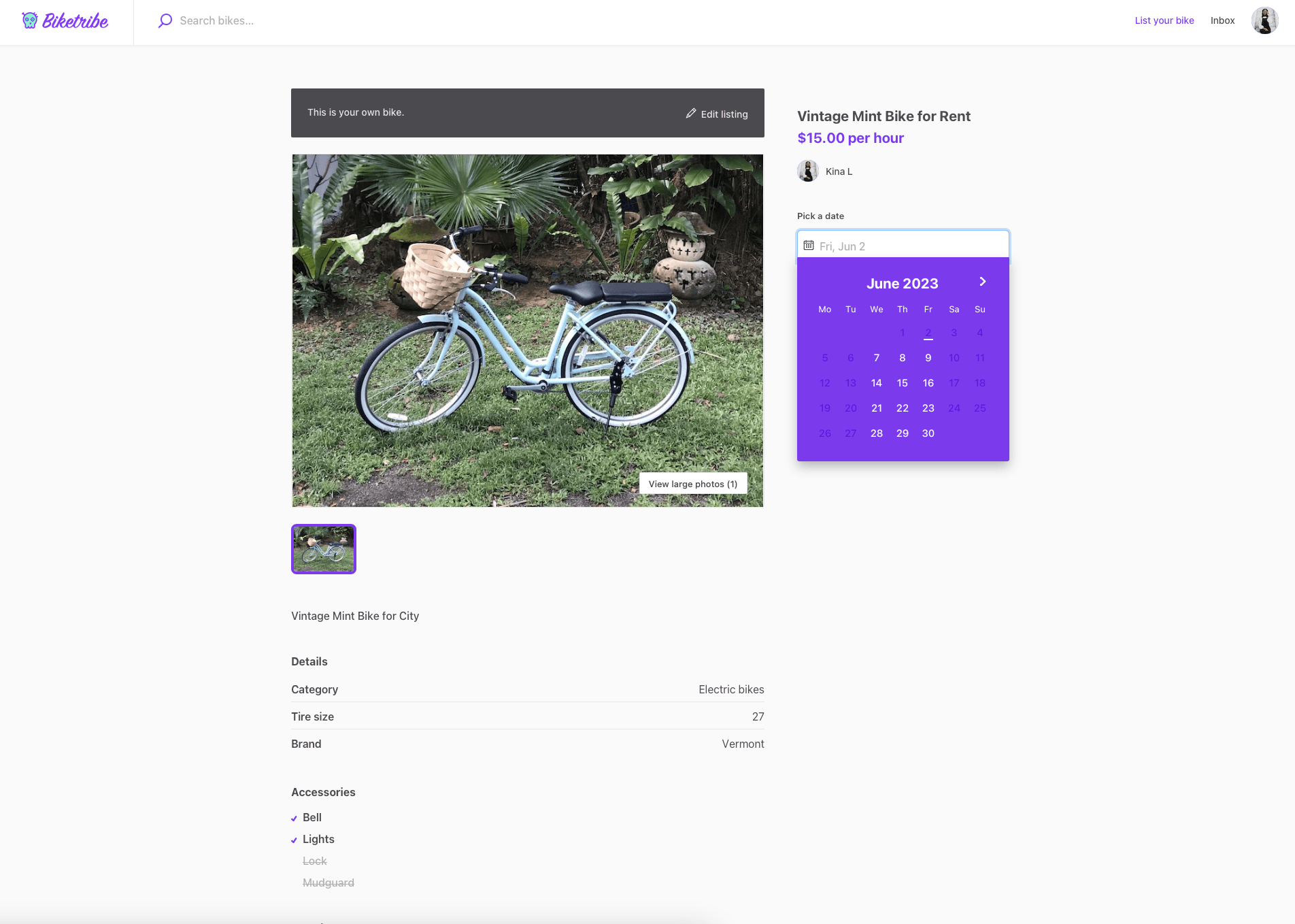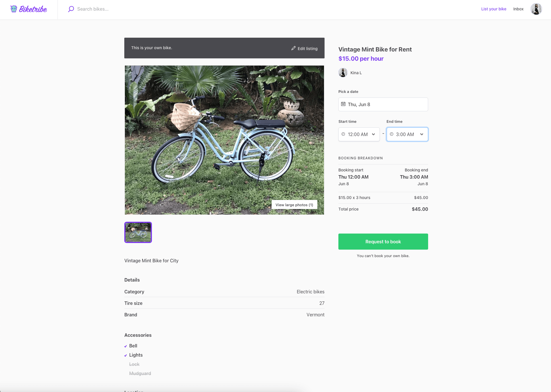 Just like for daily/nightly bookings, the booking panel provides a visual representation of available hours for buyers to select from. The date can be picked from a calendar-style pop up, whereas the time can be picked from a dropdown menu.