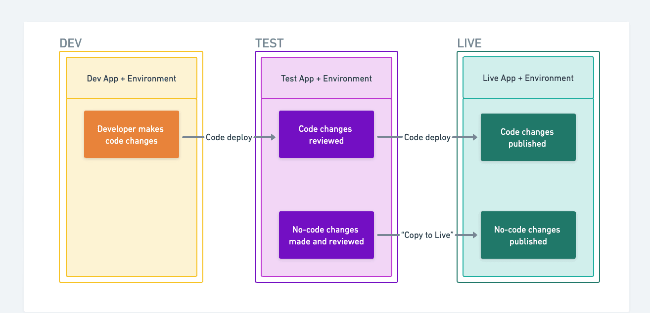 Code changes happen in the Dev environment. First, coding changes are made to your Dev marketplace. Then, once everything works, these changes are copied or deployed to your Test and, if available, Live marketplace.
