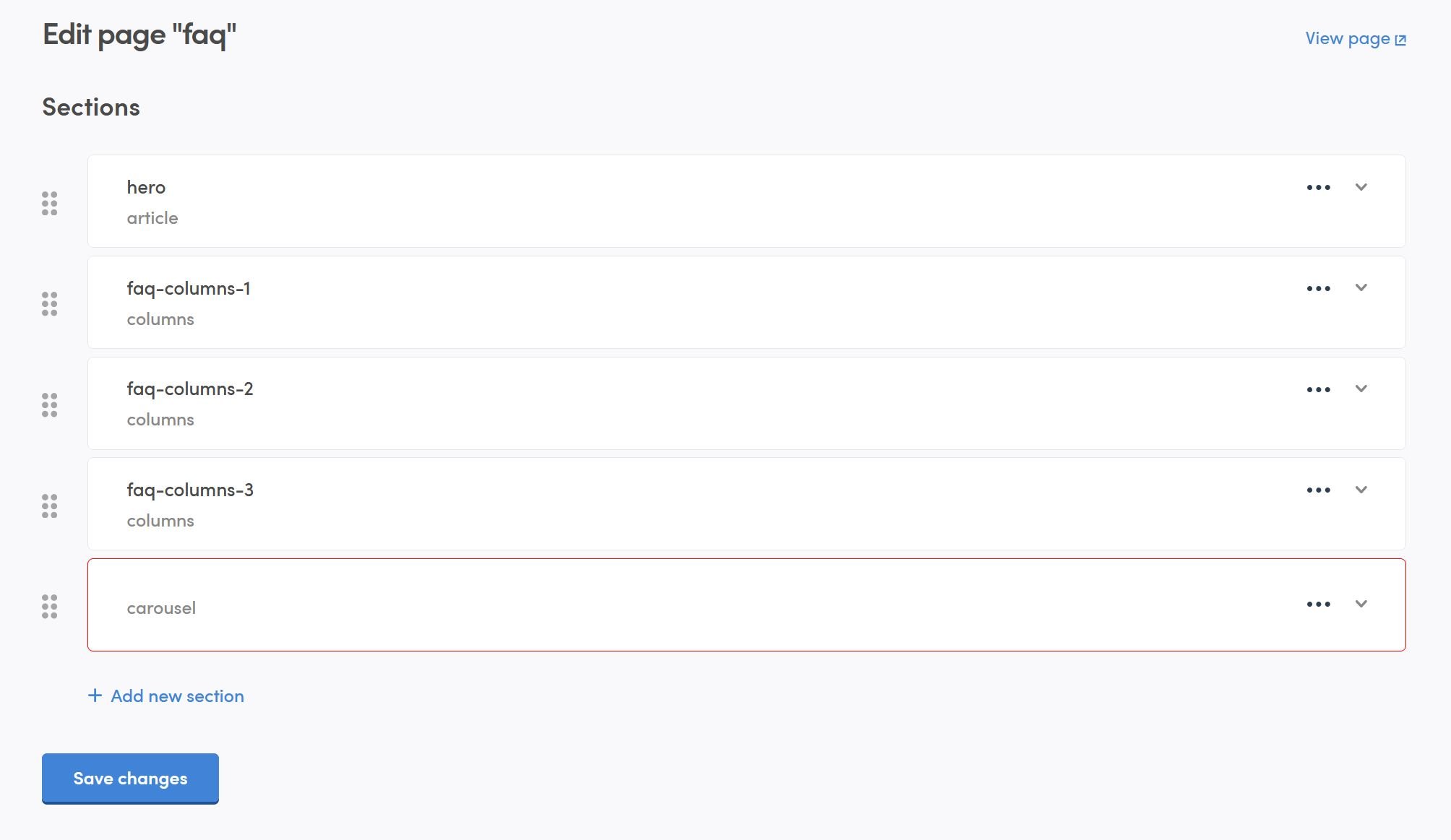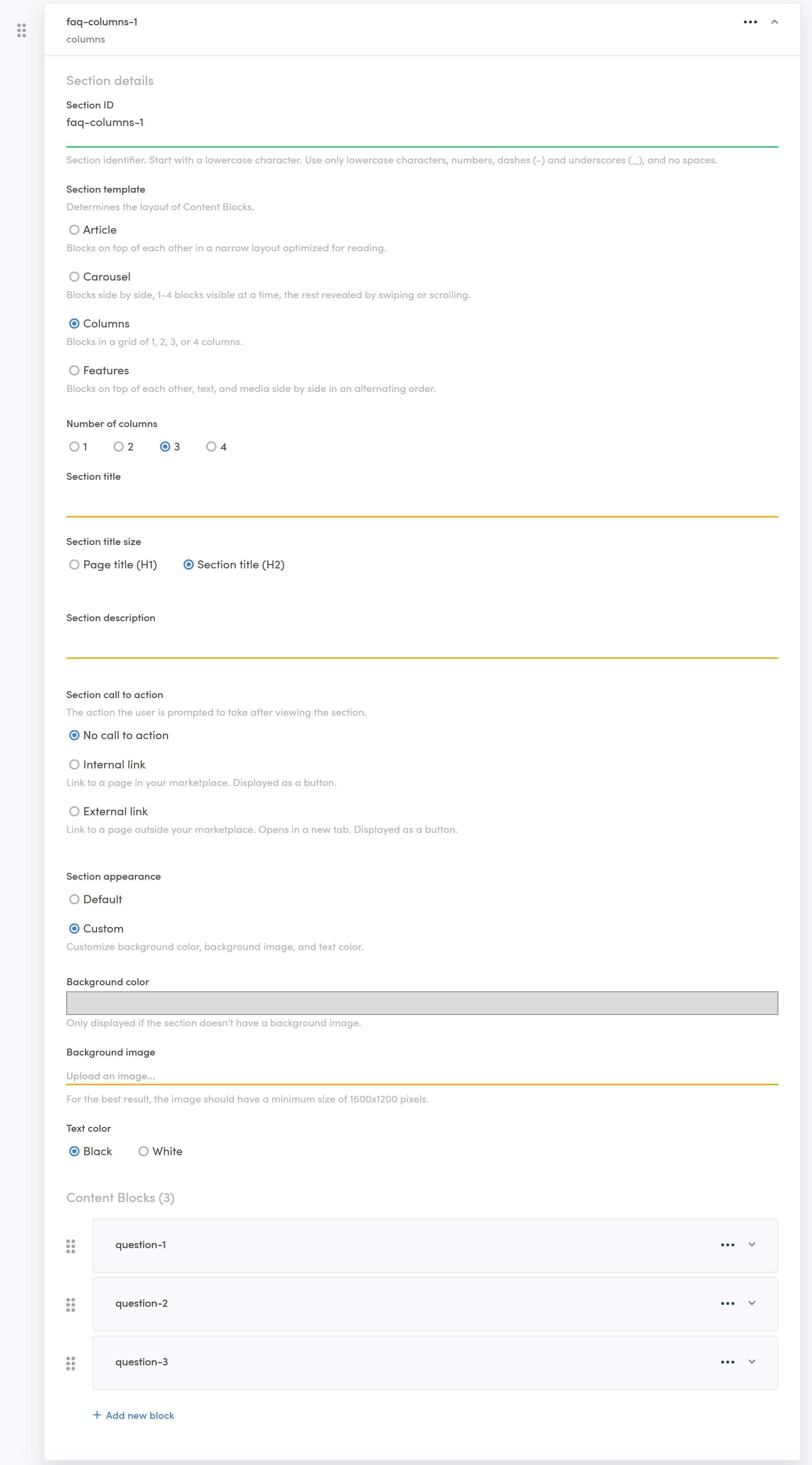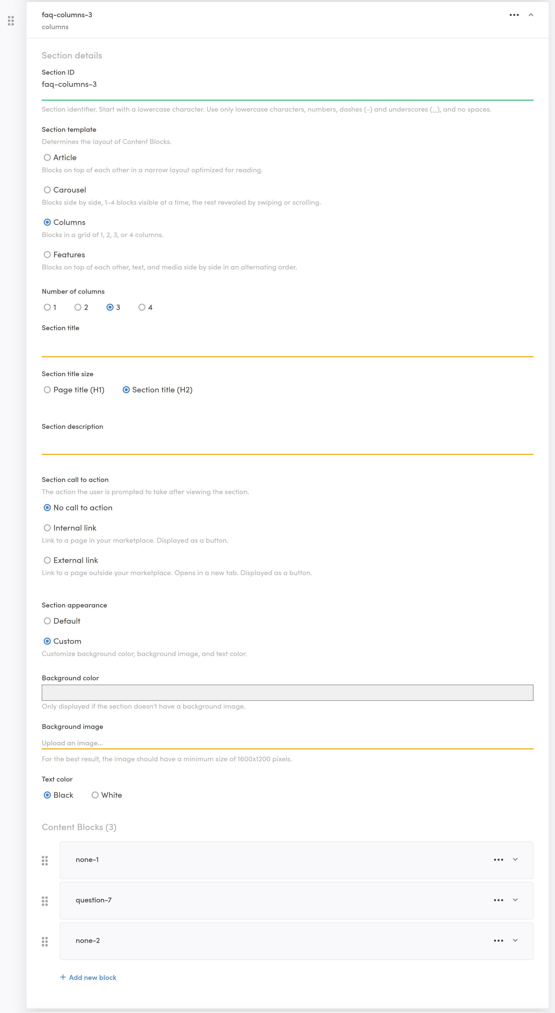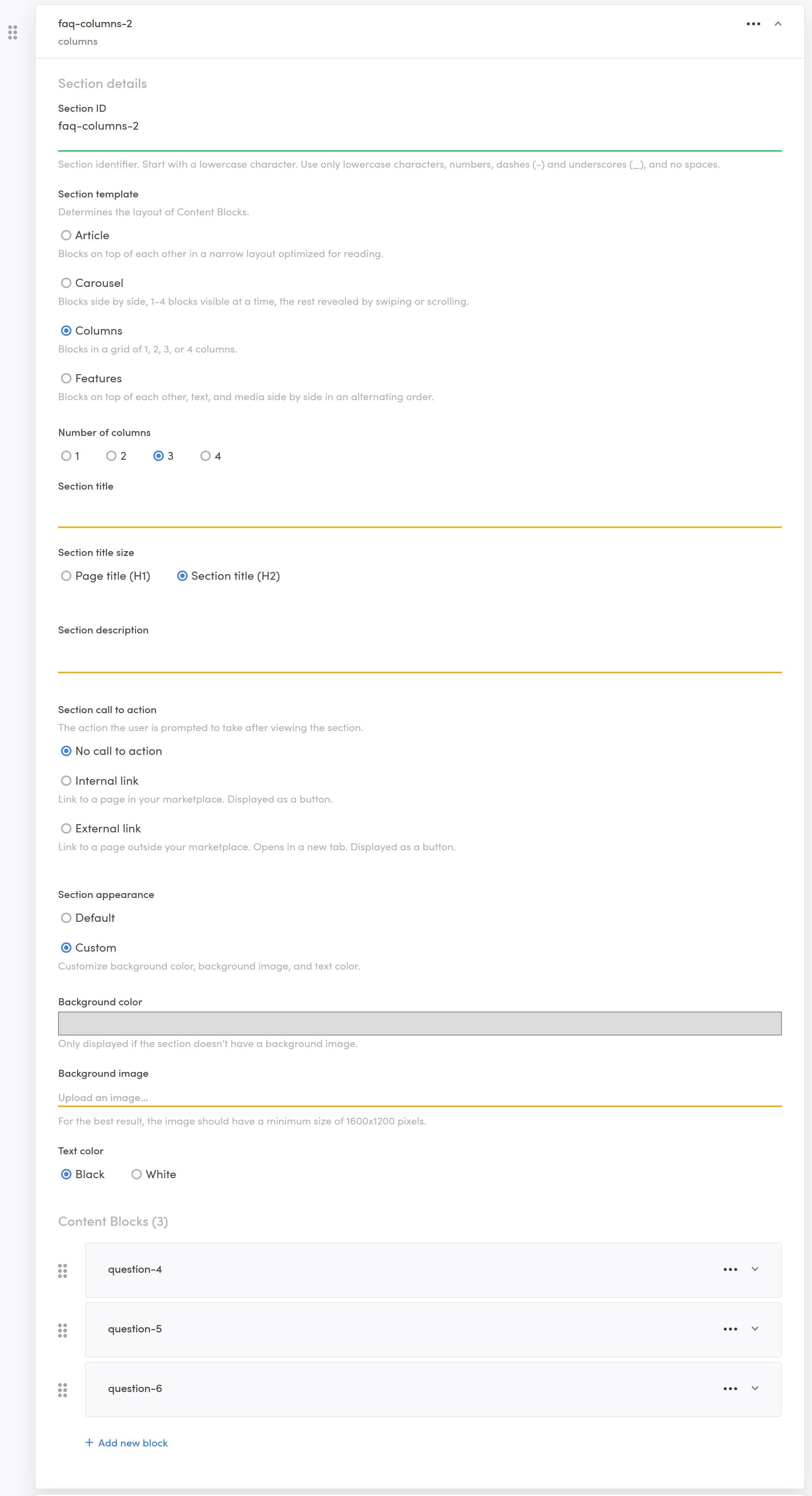 Now, we’ll create a simple Section or two that include a few columns, each of them briefly answering a question. Let’s name the Section “faq-columns-1” to illustrate that we’re creating the first column Section for the frequently asked questions.