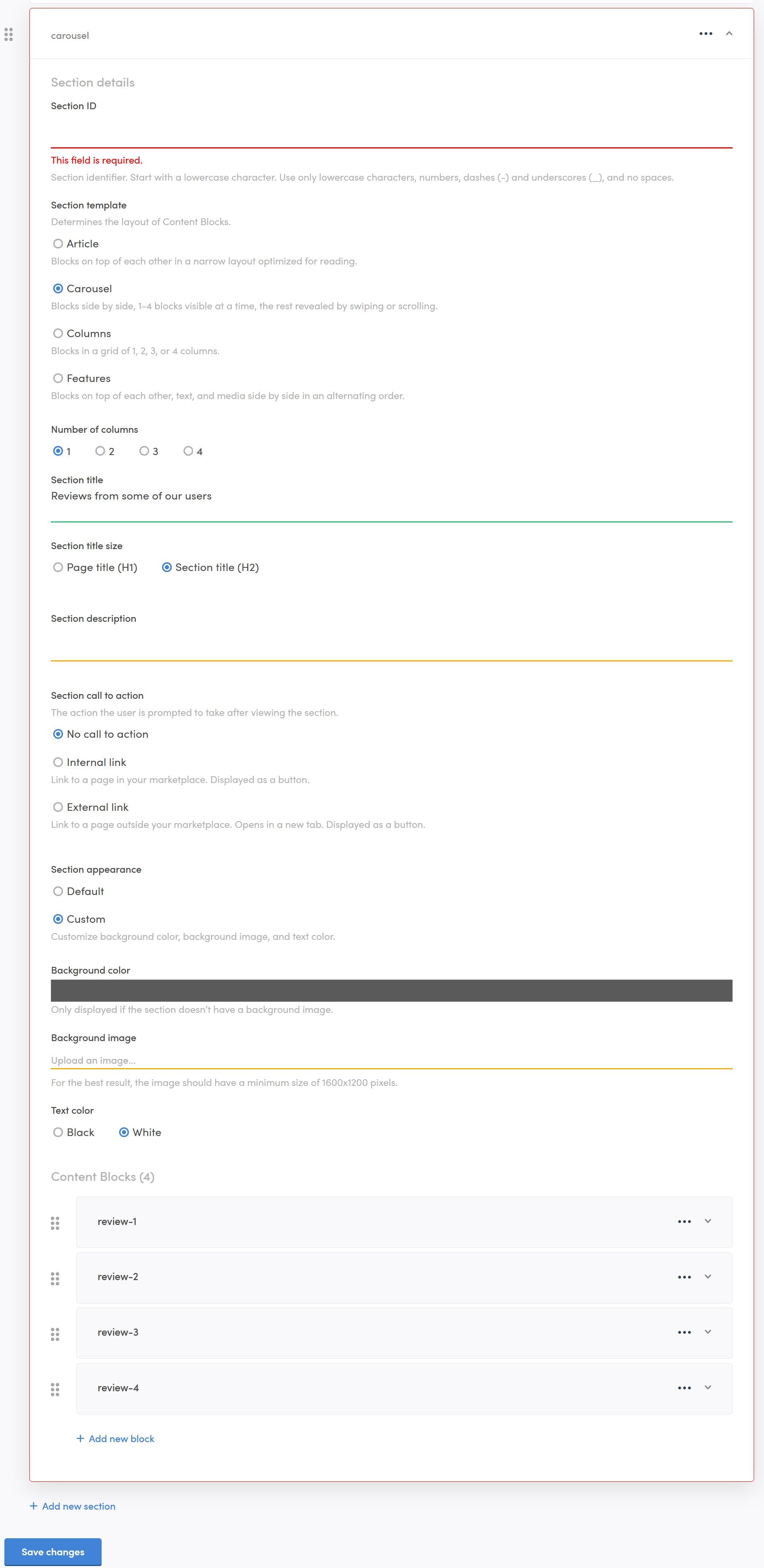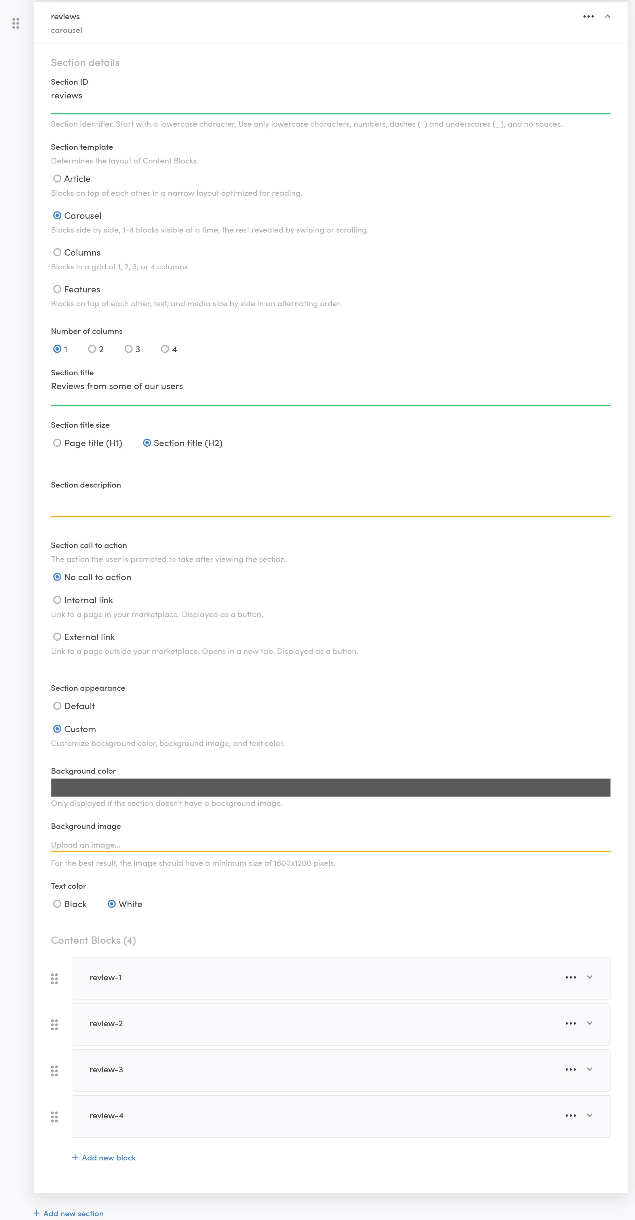 So, let’s add one more Section, and name it “reviews”. Let’s use the “Carousel” Section template, so users can browse through the reviews. Only one review needs to be in focus at a time, so let’s choose “1” as the number of columns. After giving the page a fitting title (“Reviews from some of our users”) and a proper title size (H2), we’ll set the appearance. We do not need any description or call to action here.