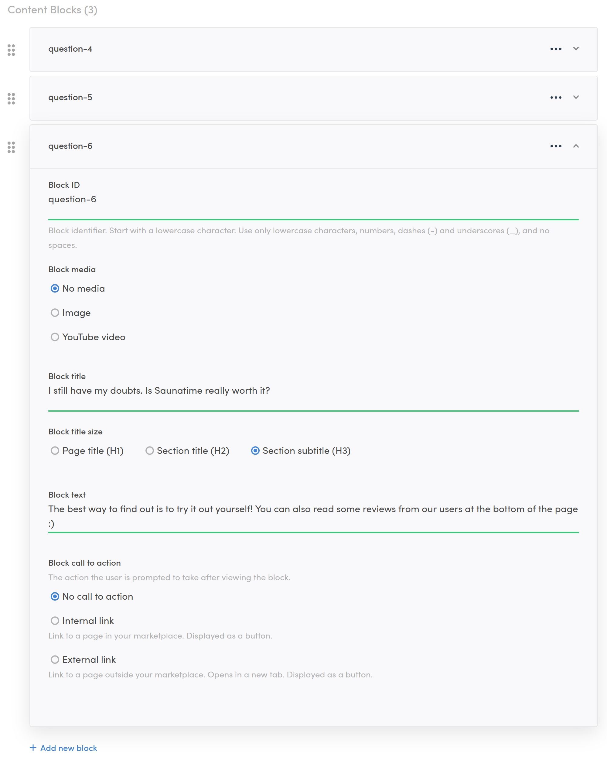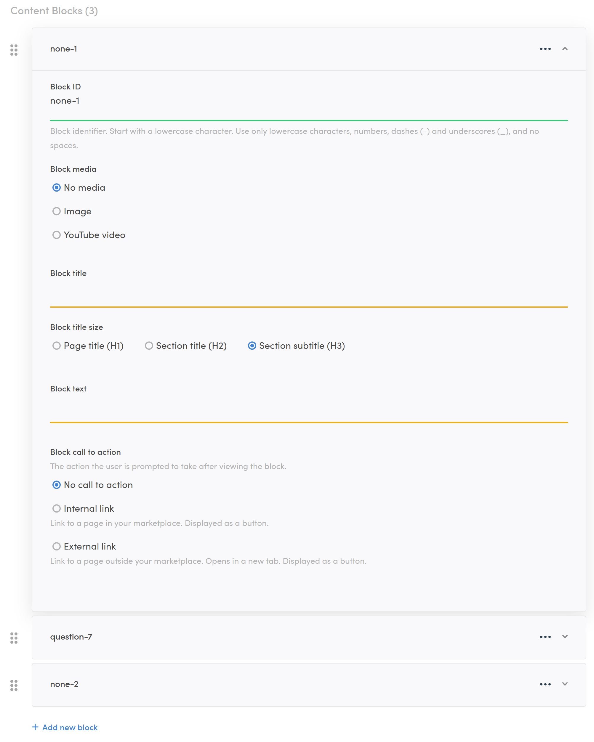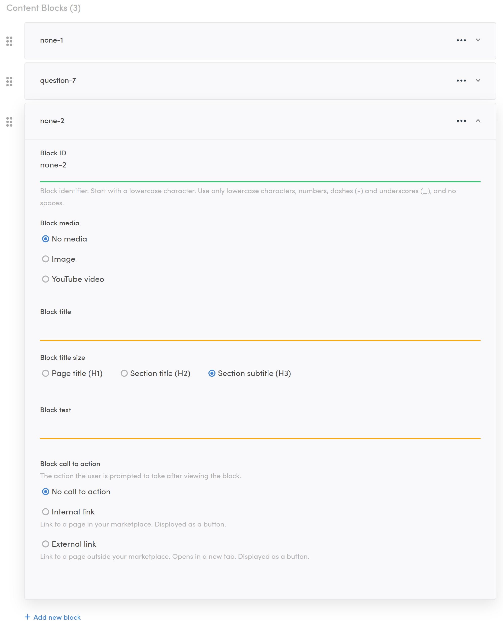 Now, the actual columns that include the questions are done by creating Blocks. We’ll click on “Add new block” at the bottom, and set the Block details.