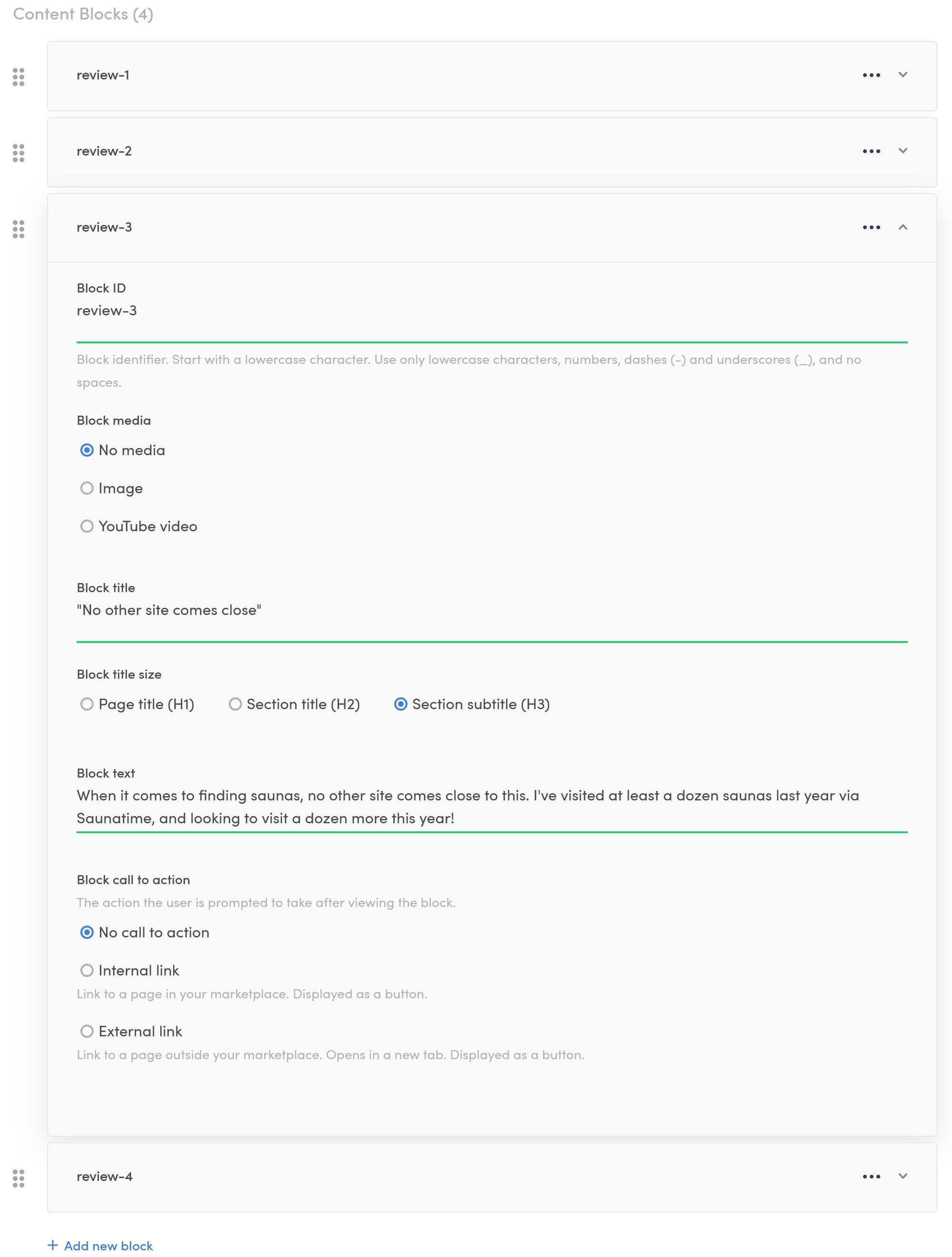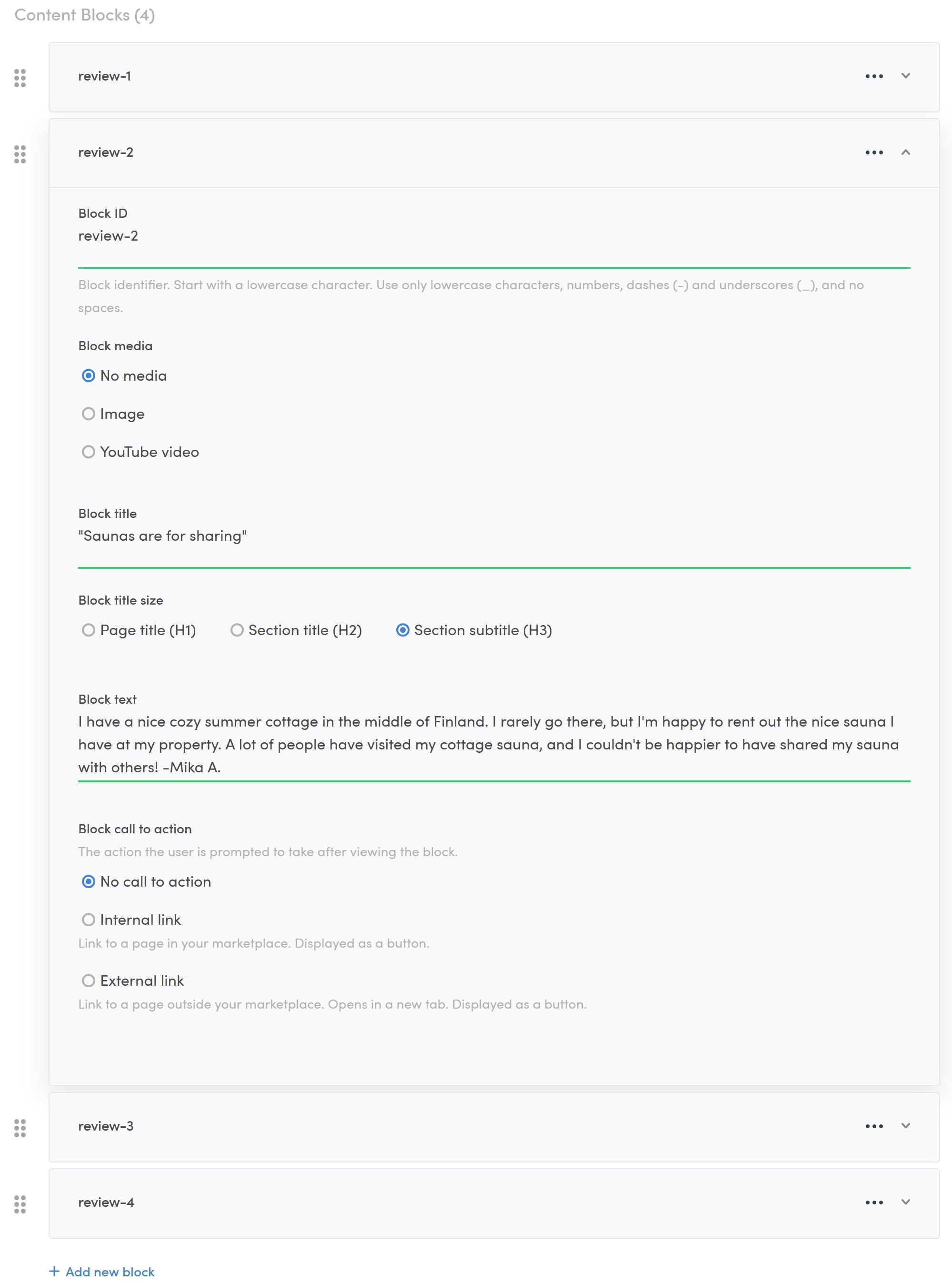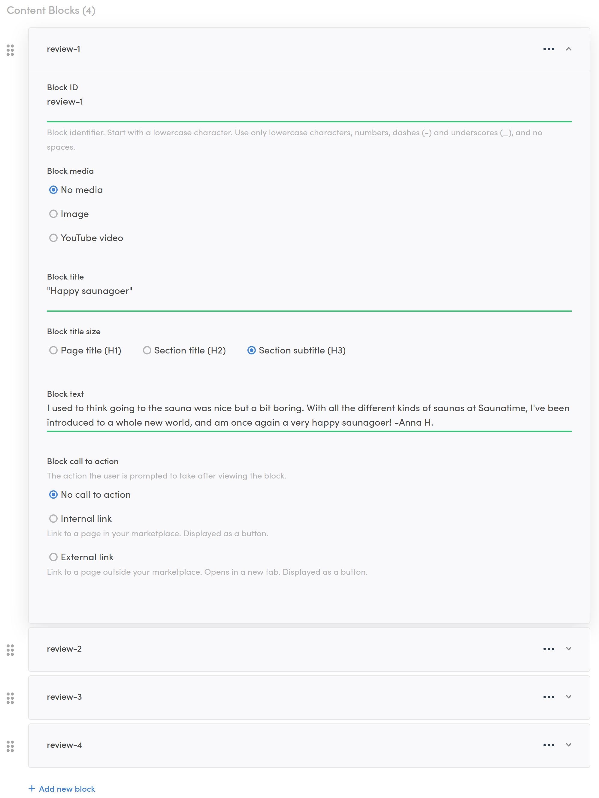 Let’s use a custom appearance, with a different background color from the other Sections (RGB 90,90,90) and white text. Then, we can add as many Blocks as we want the users to be able to browse through, in this case, 4. Each of these Blocks can get a fitting ID (such as review-1), a quote from the review in the title, and the full review in the ‘Block text’ Field.