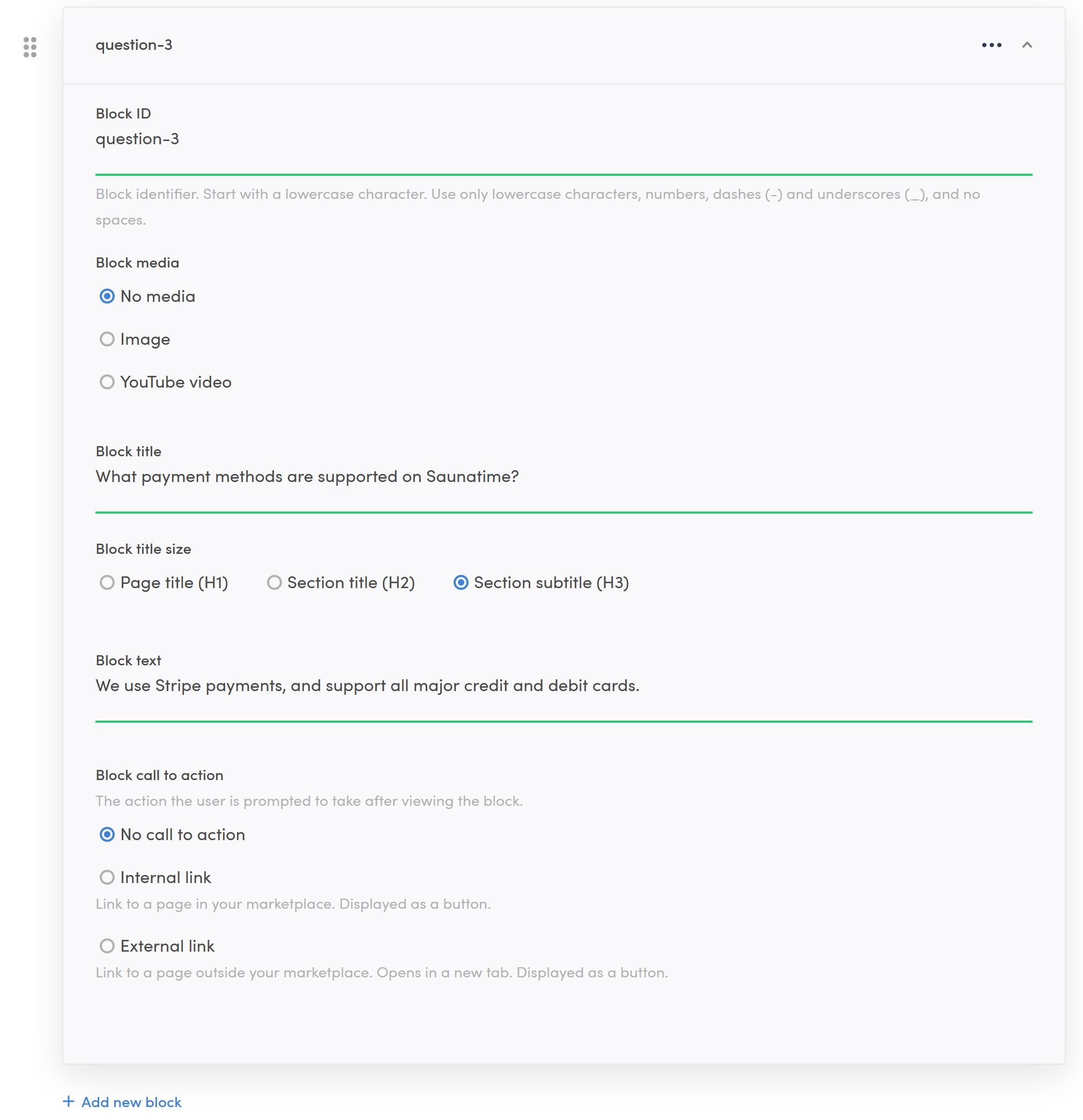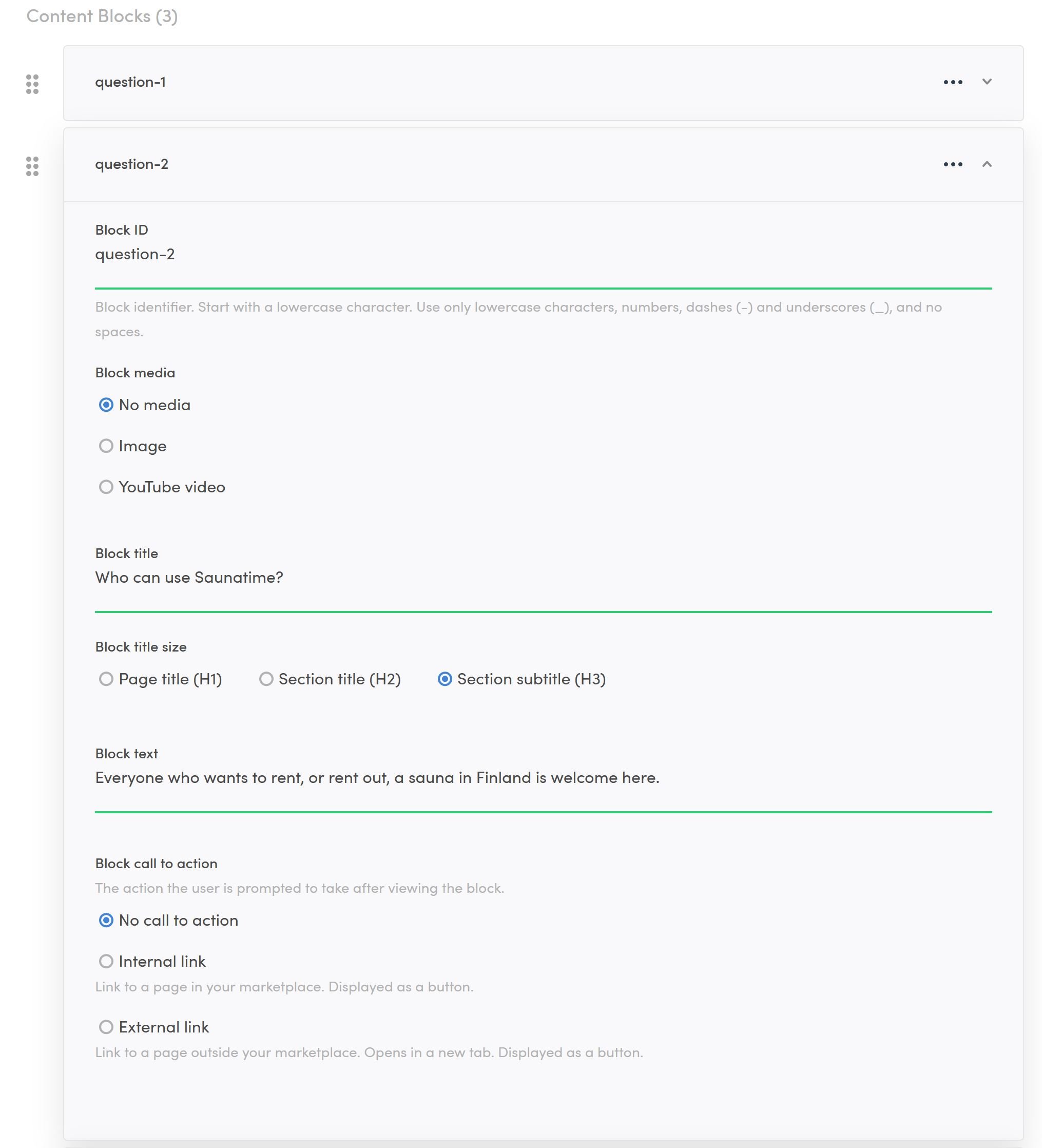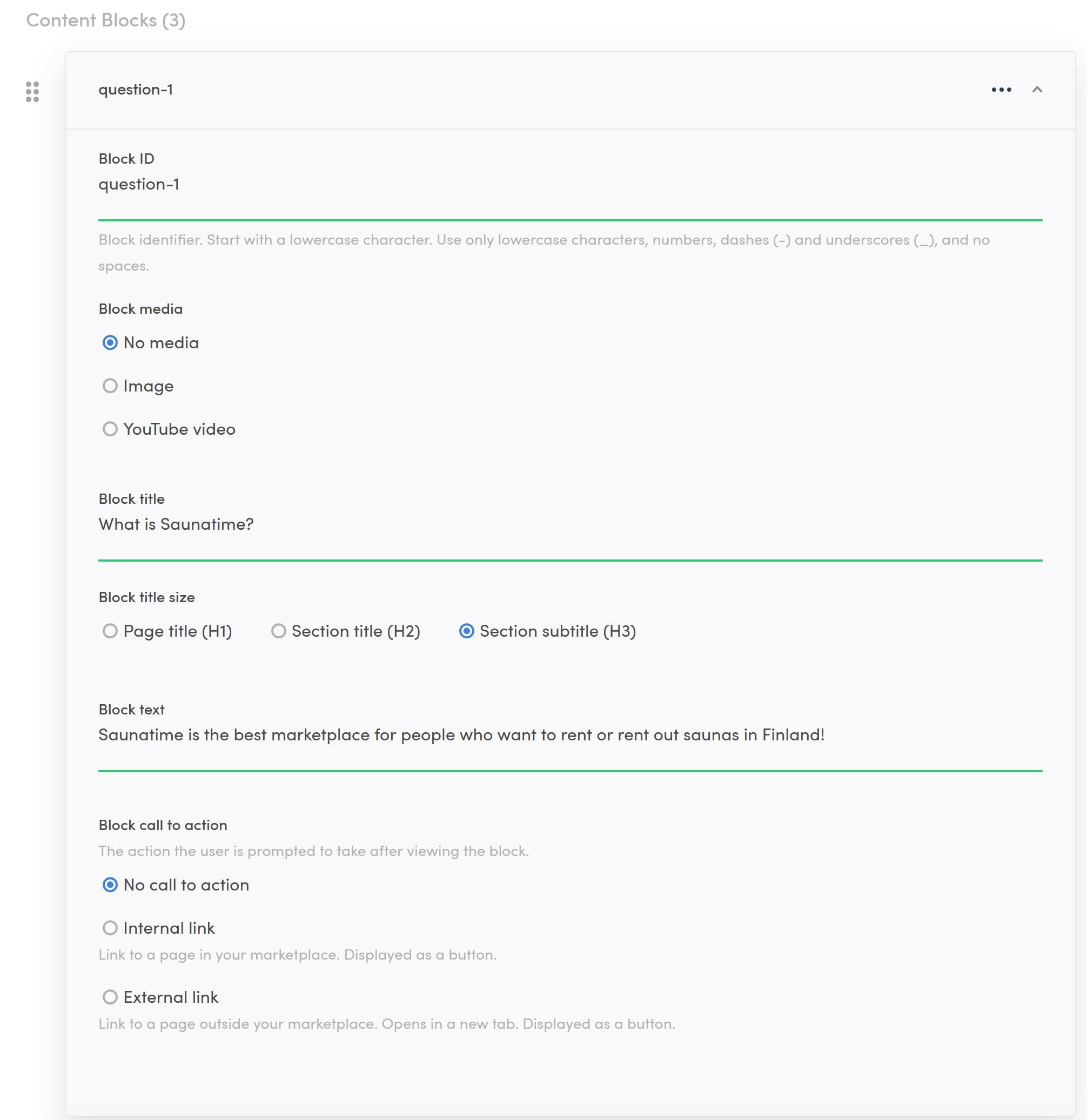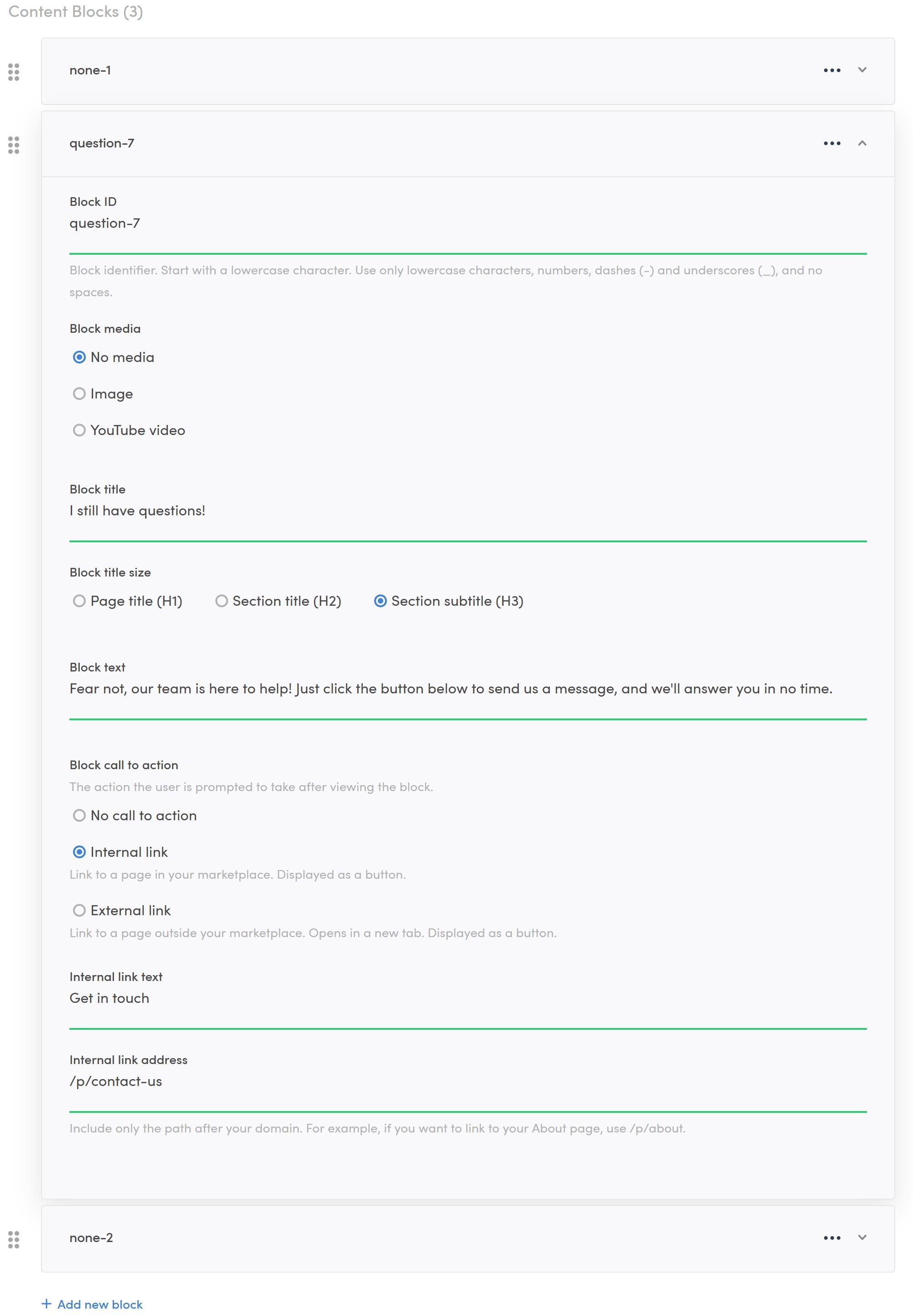 Since we want people to contact us if they have questions, let’s also add a ‘call to action’ to the middle Block. This could either be a link to an internal or an external page. In this case, we want to use an internal link that says “Get in touch”, so let’s write “Get in touch” in the “Internal link text” Field. Regarding the link address, the structure of internal links always includes the marketplace URL address, so if the marketplace was located at https://www.example.com/, all the internal links would start with that base URL address. So in order to create a link leading to https://www.example.com/p/contact-us, we just need to write “/p/contact-us” in the “Internal link address” Field - in our example marketplace, there is a live contact form at that address.