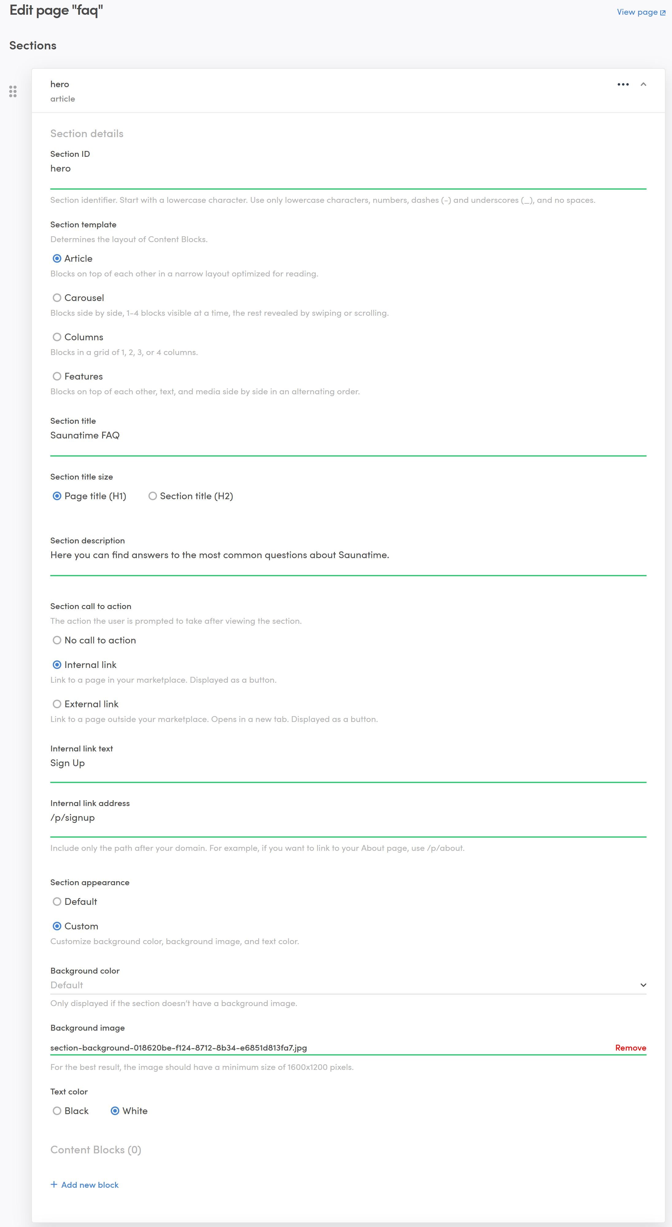 Let’s first create an introduction where we tell our users what the FAQ Section is all about. We’ll create our introduction using a Section using the single column template and with a fitting title and a text block, no call to action, and a Section appearance of our choosing. We don’t need to create additional Blocks because we do not want to include any other content in this Section. Note that you can also use Markdown when editing content with Pages. Markdown enables you to easily format text with bold characters and italics, it allows you to create lists, and much more.