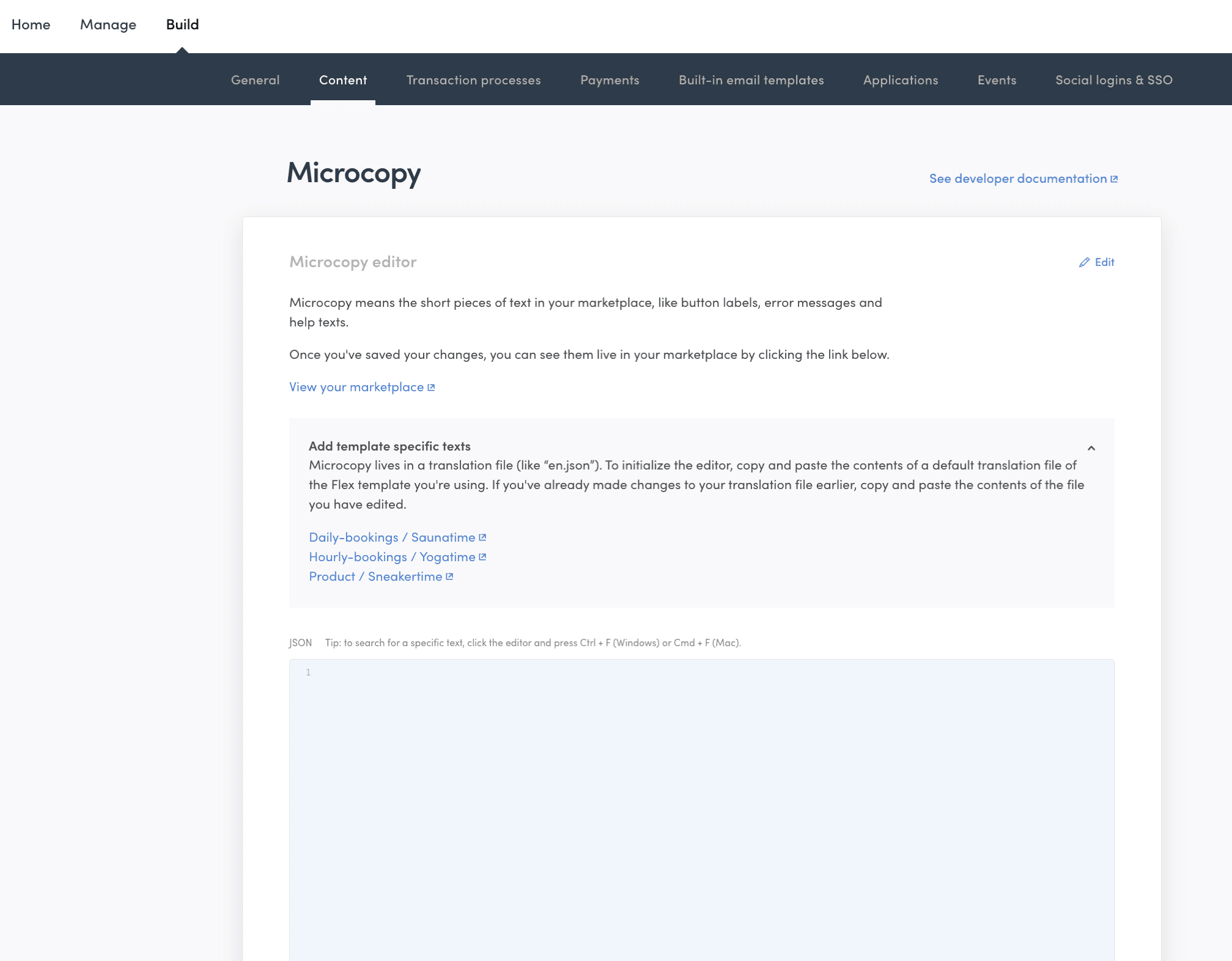 When you first start building your marketplace, the JSON field in Microcopy is empty, and all microcopy comes from built-in microcopy files in the Template. (We refer to these texts as microcopy, but in the Template they are in the translations folder. In addition to the default en.json file, there are other languages available, which is why the folder is titled translations.)