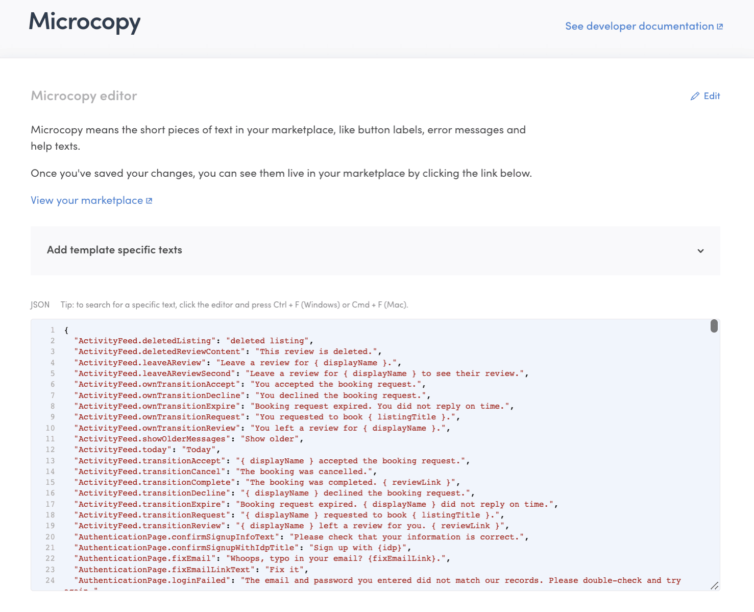 With your marketplace’s microcopy file copied into the editor, you can use the editor to modify your marketplace’s copy-texts.