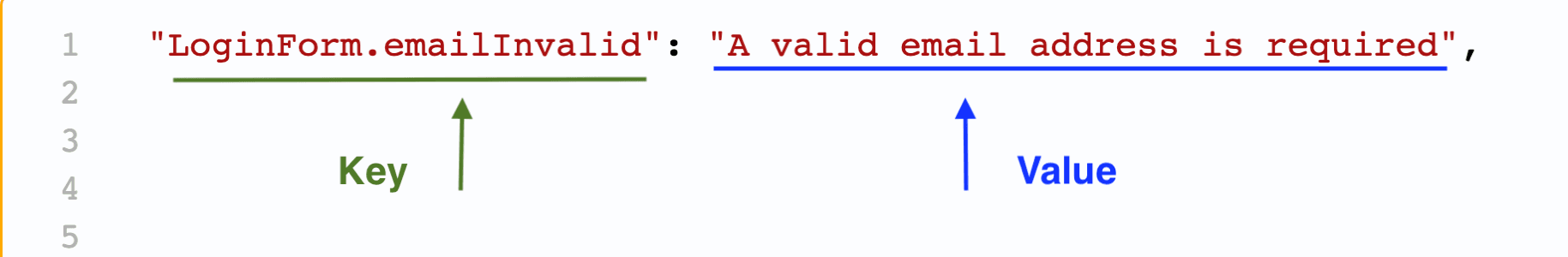 - Values are the pieces of microcopy used in the particular area pointed to by the keys. During the use of an invalid email during login described by “LoginForm.emailInvalid,” the default value is “A valid email address is required.”