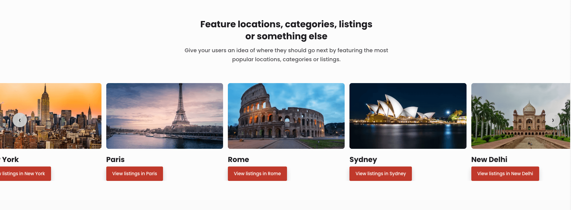 An example carousel section from the starting Landing page. The default code of the marketplace application renders carousels and all content created using Pages following a standard design. Developers can change this design anytime.