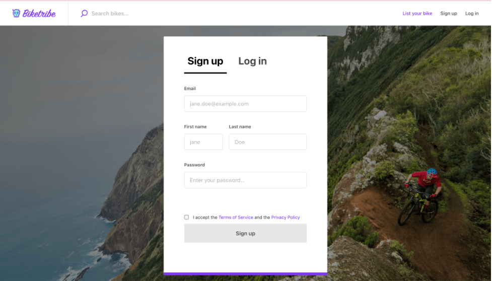 The image should be appealing and give users a glimpse into your marketplace, what they should look forward to. It is a great way to give another good impression to new users. Don't be scared to use a significant image, or even a full color block (saved as an image) if it suits your brand. It should have a 2:1 aspect ratio and a minimum size of 1200x600 pixels. The background image for the login pages can be a maximum of 2400px wide. Here’s an example of how the background image would look in the signup page: