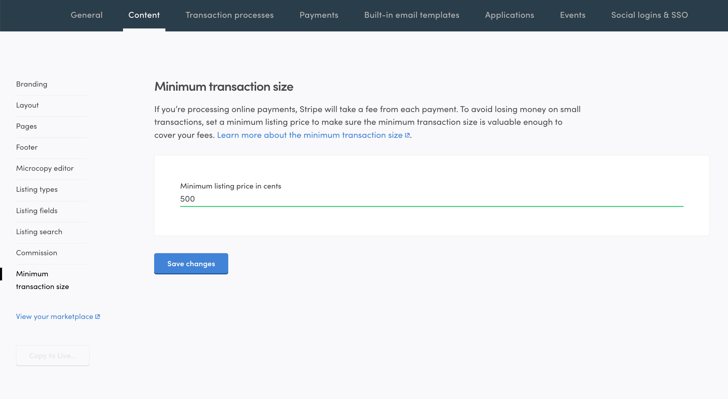 In this tutorial, we changed the marketplace currency and set a minimun price for transactions using the no-code UI in Console. Currency needs to be edited through the configDefault.js file and changing the currency code to the desired value. You should consider what you want to set as the minimum transaction price of your marketplace. The recommendation is that the minimum listing price be at least the same as Stripe's minimum charge amount in the country you are operating. If the listing price is lower than Stripe's minimum charge amount, Stripe will not process the payment and the transaction will fail.