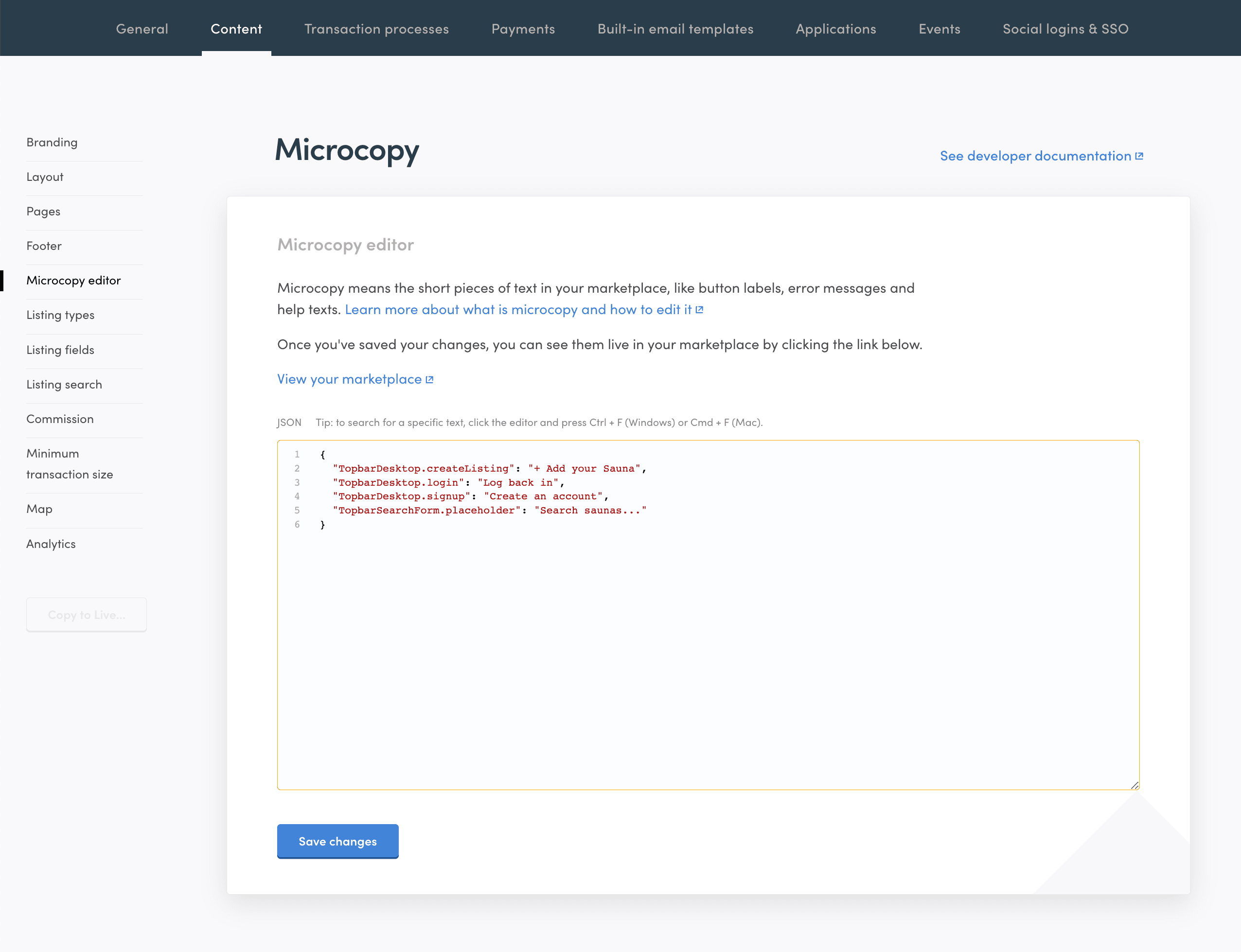 In this tutorial section, you will learn what is microcopy and how to change it using the no-code interface in Console. We will change the Bike-themed microcopy to match our Sauna-themed marketplace.